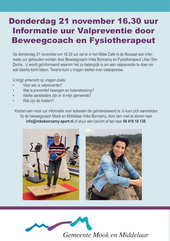 Op donderdag 21 november om 16.30 uur zal er in het Môks Café in de Boszaal een informatie uur gehouden worden door de Beweegcoach Imke Bonnamy en Fysiotherapeut Lilian Sim Zecha . U wordt geïnformeerd waarom het zo belangrijk is om aan valpreventie te doen en wat daarbij komt kijken. Tevens kunt u vragen stellen over osteoporose.