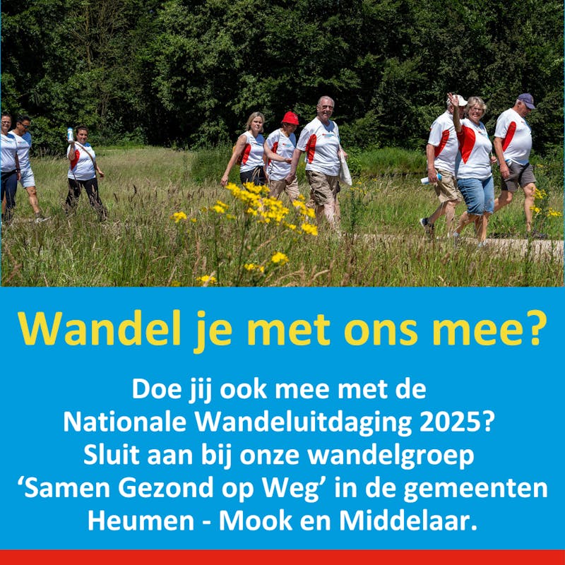 Gezondheidscentra Samen Gezond doet mee aan de Nationale Wandeluitdaging 2025. Vanaf 3 april wandelen wij elke week, ongeveer 22 weken lang, onder de naam ‘Samen Gezond op Weg’ in de gemeenten Heumen – Mook en Middelaar. Samen trainen we voor een wandelafstand van 3, 5, 10 of 15 kilometer. Wil je werken aan je gezondheid? Je bent van harte uitgenodigd om met ons mee te wandelen.