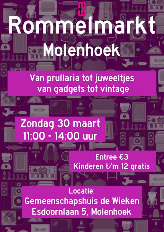 Op zondag 30 maart staat alles in de Wieken uitgestald, waar u van harte welkom bent tussen 11:00 uur en 14:00 uur om al dan niet via handjeklap, andere bruikbare spullen terug te kopen. Van ieder kopje, tafeltje, schilderijtje, lamp, fiets, boek, speelgoed, gereedschap of vintage items wordt de opbrengst besteedt aan activiteiten van de Meulenwiekers. De entree bedraagt € 3, - en kinderen t/m 12 jaar mogen gratis naar binnen.