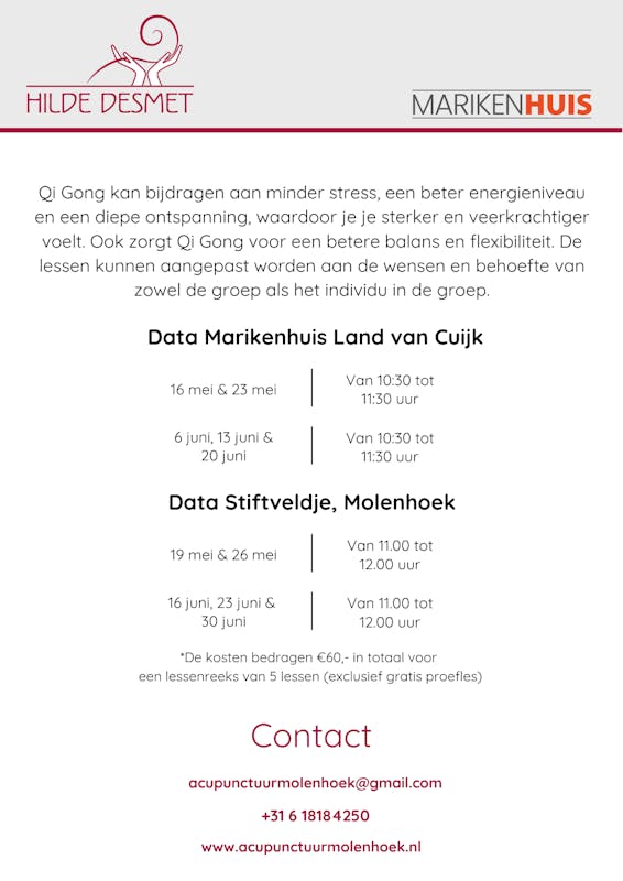 In samenwerking met het Marikenhuis Land van Cuijk organiseert Hilde Desmet dezelfde cursus vanaf vrijdag 16 mei om 10.30 -11.30 in het Marikenhuis Land van