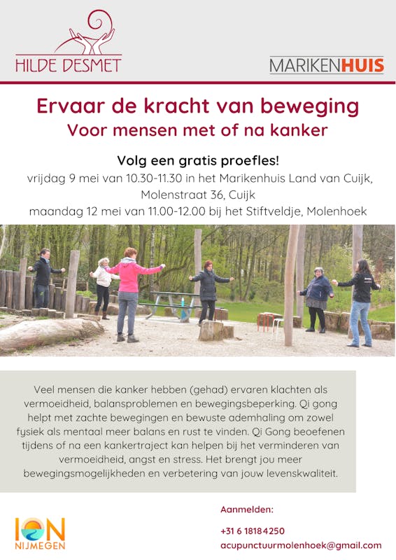 Op maandag 19 mei start onder leiding van Qi Gongdocente Hilde Desmet op het Stiftveldje in Molenhoek een korte cursus Qi Gong voor mensen met of na kanker. De cursus bestaat uit 5 lessen van 11.00-12.00.