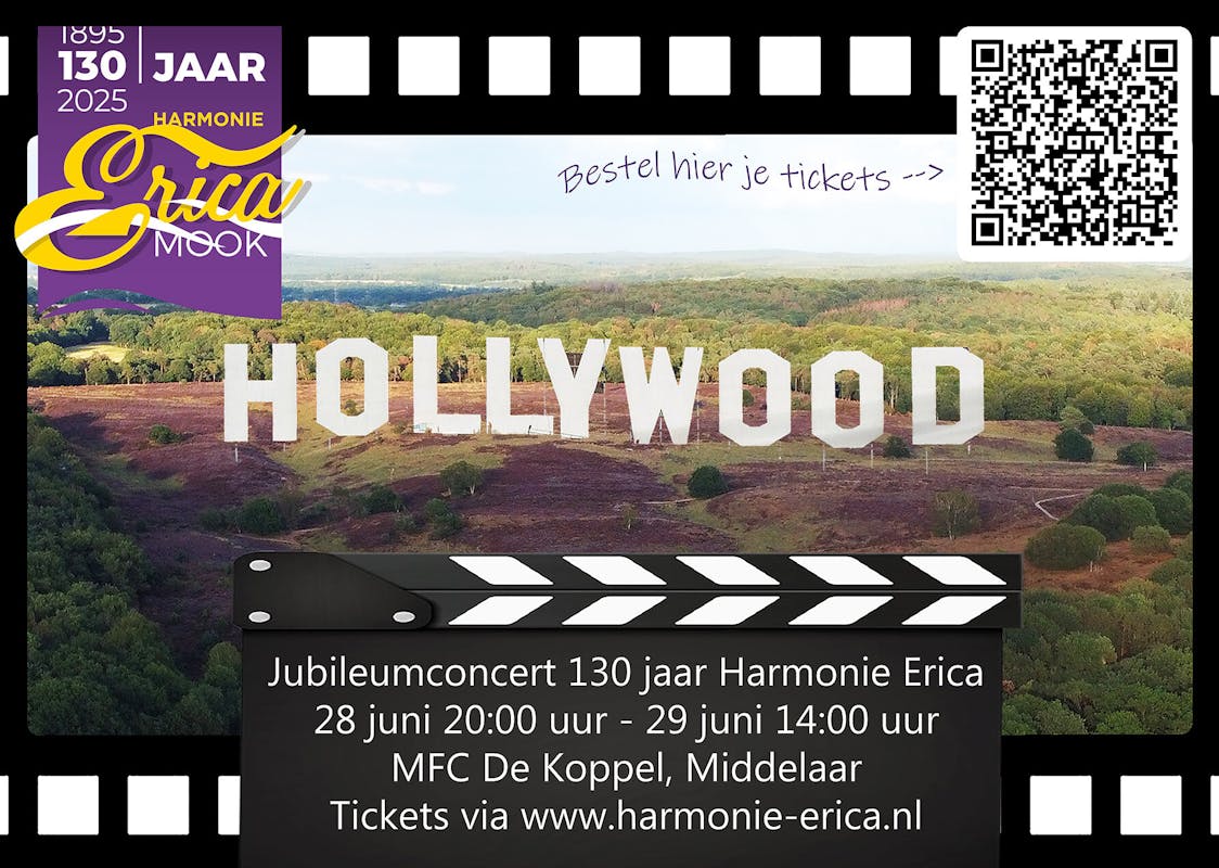Harmonie Erica is 130 jaar! Dat vieren we met niet één, maar twee jubileumconcerten in Hollywood-thema. Kom genieten van muziek en film op zaterdag 28 juni om 20.00 uur (zaal open om 19.00 uur) en/of op zondag 29 juni om 14.00 uur (zaal open om 13.00 uur) in MFC De Koppel in Middelaar.