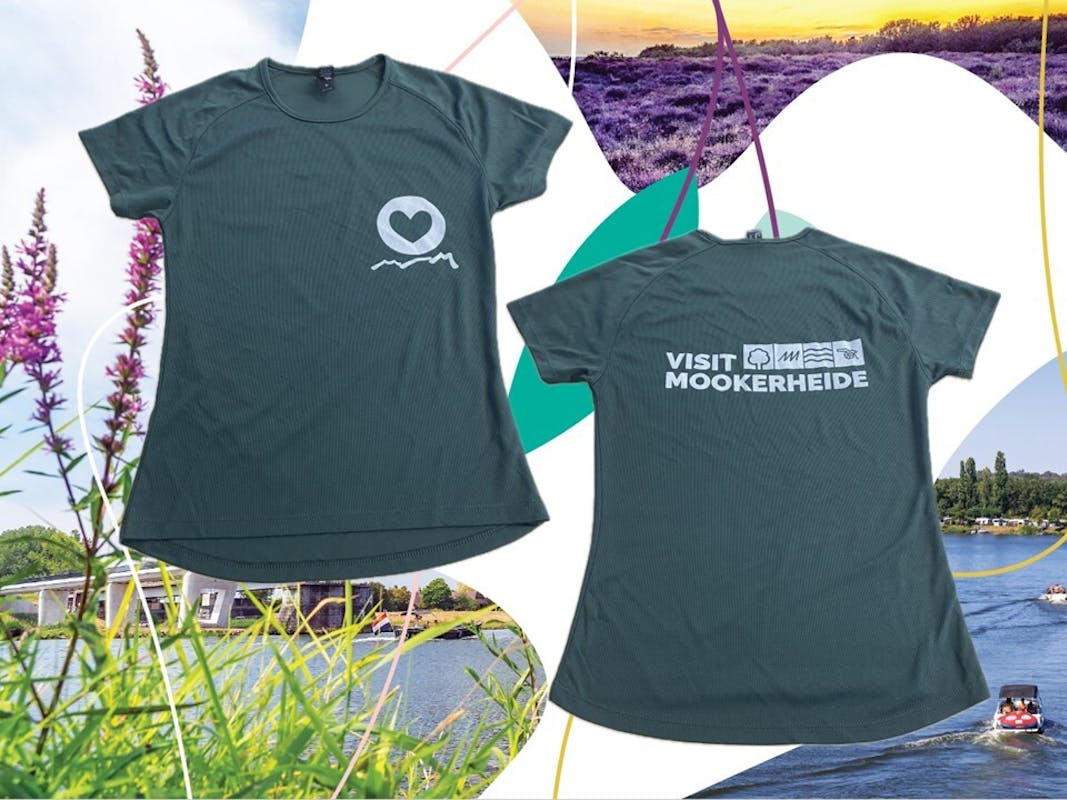 Het shirt is bosgroen – passend bij de Groene Dag, wanneer de 4Daagse door onze prachtige gemeente loopt. Voorop prijkt een hartje met daaronder de M’en van Mook en Middelaar, achterop promoten we trots Visit Mookerheide. Het is een comfortabel, dun sportshirt dat je hopelijk ook ná de 4Daagse nog met plezier draagt.