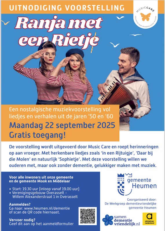 Een nostalgische muziekvoorstelling vol liedjes en verhalen uit de jaren '50 en '60. Voor alle inwoners van de gemeente Heumen en Mook en Middelaar.
