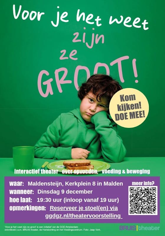 Wat: Interactief theater over opvoeden, voeding en beweging Waar: Maldensteijn, Kerkplein 8, Malden Wanneer: Dinsdag 9 december 2025 Tijd: Inloop vanaf 19.00 uur (met koffie en thee), voorstelling van 19.30 tot 21.00 uur.