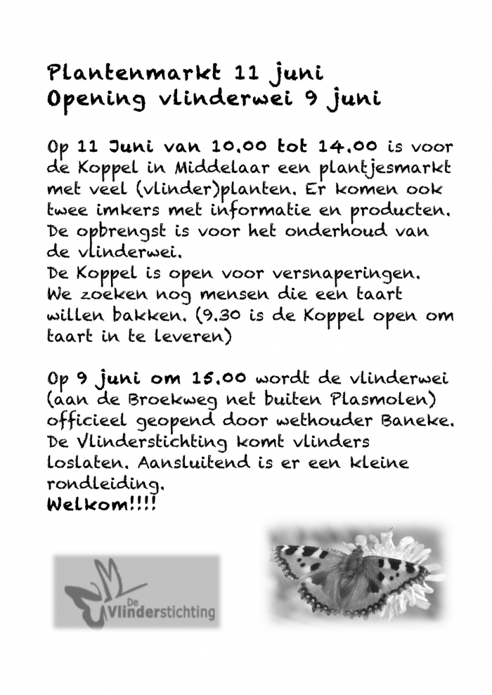 Op 9 juni om 15.00 wordt de Vlinderwei geopend door wethouder Baneke. De Vlinderstichting komt vlinders loslaten. Aansluitend is er een kleine rondleiding. Iedereen is welkom!