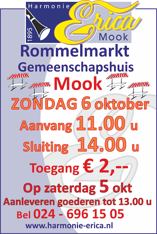 In het weekend van zaterdag 5 oktober en zondag 6 oktober houdt Harmonie Erica uit Mook haar jaarlijkse rommelmarkt.