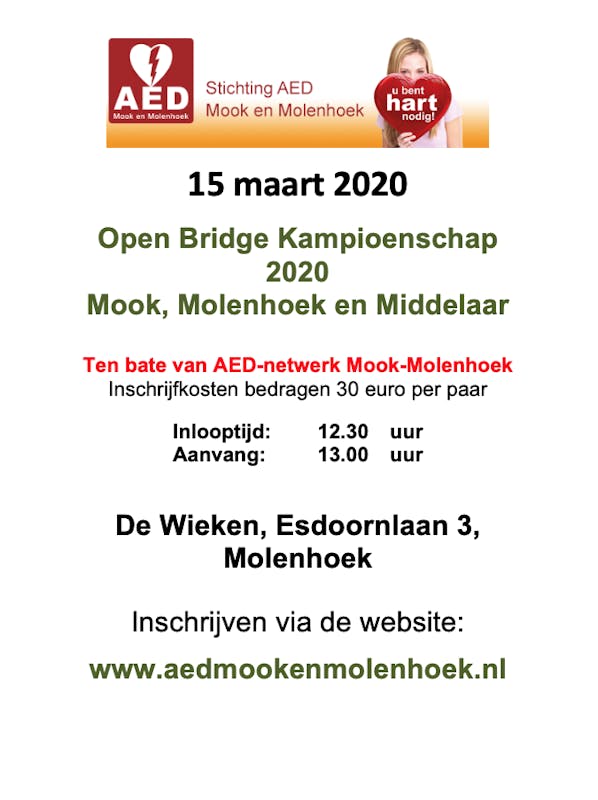 Op 15 maart 2020 Open Bridge Kampioenschap 2020 Mook,Molenhoek en Middelaar. Inschrijfkosten € 30,- per paar. Ten bate van AED netwerk Mook-Molenhoek. Inlooptijd 12.30, aanvang 13.00 uur.
