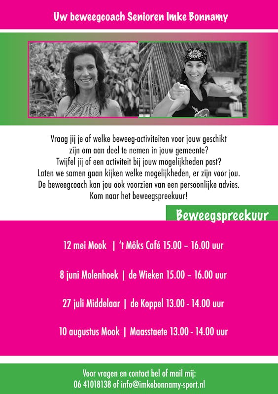 Ik zie u graag bij het beweegspreekuur! U bent van harte welkom met al uw vragen over bewegen in uw gemeente! Groet Imke Bonnamy Beweegcoach Mook en Middelaar.
