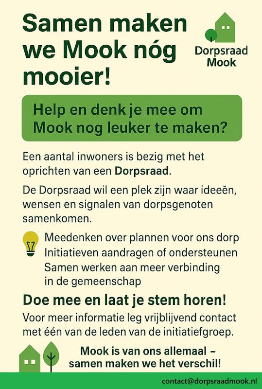 Een aantal inwoners van Mook heeft een initiatiefgroep gevormd om te kijken of het lukt om een dorpsraad Mook op te richten. Onze groep is nog klein, maar met jouw hulp kunnen we groeien! We kunnen alle hulp gebruiken en missen bijvoorbeeld nog deelnemers die enthousiast zijn om een dorpsraad te besturen. Word jij graag onderdeel van onze dorpsraad? Neem dan contact met ons op via