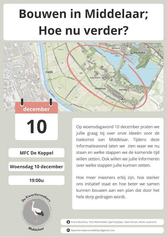 Op woensdagavond 10 december praten we jullie graag bij over onze ideeën voor de toekomst van Middelaar. Tijdens deze informatieavond laten we zien waar we nu staan en welke stappen we de komende tijd willen zetten. Ook willen we jullie informeren over welke stappen jullie kunnen zetten.