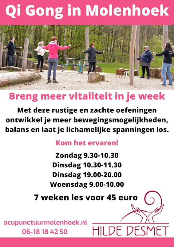 Vanaf 13 maart komen er extra Qi Gong mogelijkheden in Molenhoek. Een subsidie vanuit het Lokaal Sportakkoord maakt het mogelijk Qi Gong aan te bieden tegen gereduceerd tarief. Hilde Desmet heeft hiervoor tot de zomer wekelijks vier lessen ingepland, waarbij het mogelijk is te wisselen van lestijd of lesdag.