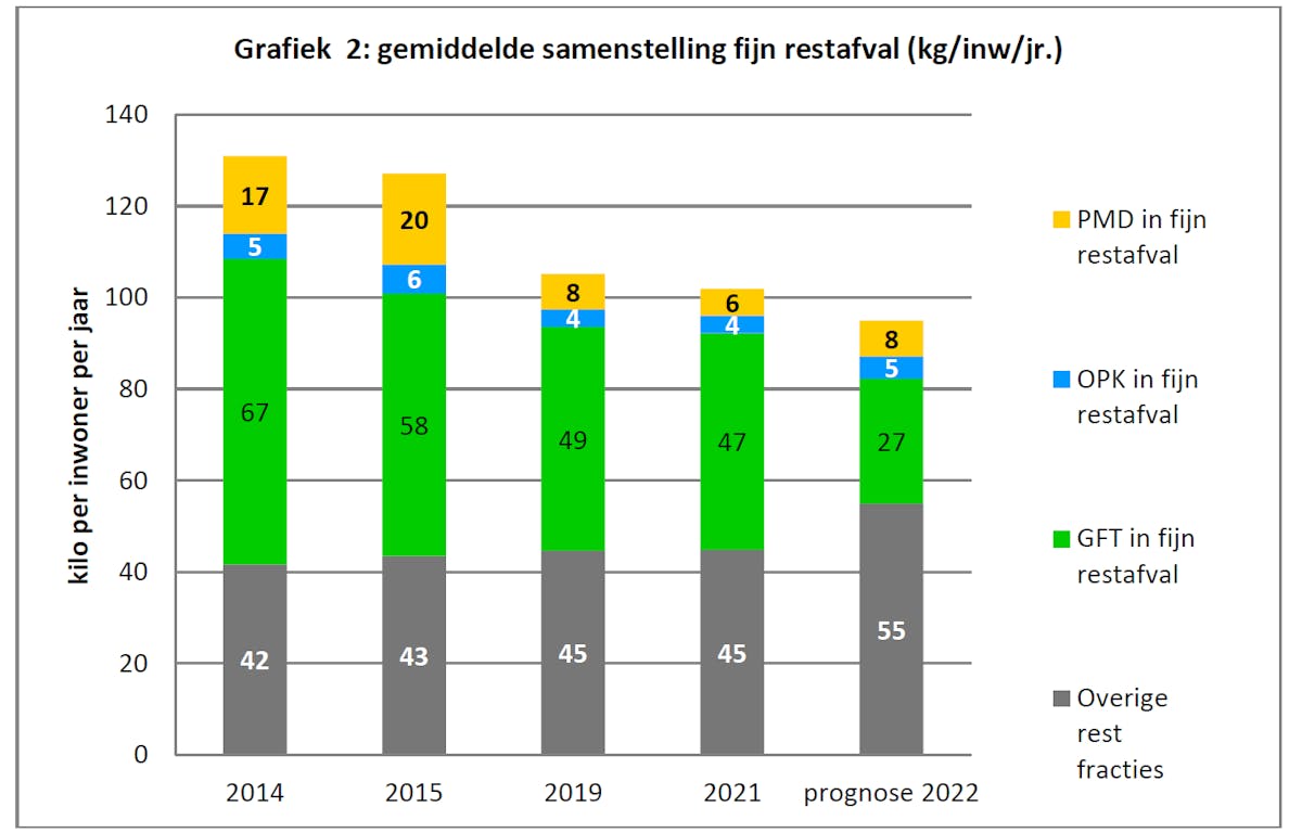 We bieden steeds minder restafval aan. Dat is een goede ontwikkeling. In de grafiek ziet u dat we in 2014 nog rond de 130 kilo per persoon per jaar zaten. In 2022 is dat 95 kilo. In 2030 moeten we naar 30 kilo huishoudelijk restafval per persoon per jaar.