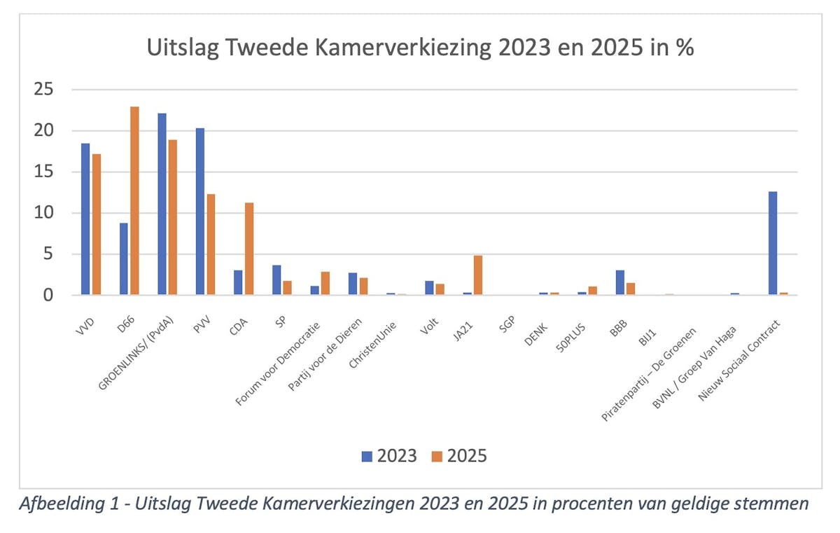 In afbeelding 1 staan de resultaten voor 2023 en 2025 grafisch weergegeven, in procenten van het aantal geldige stemmen.