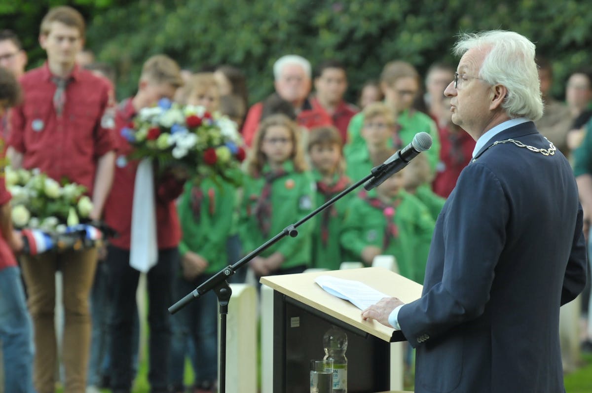 (bericht van de gemeente) In Mook heeft onder grote belangstelling de jaarlijkse dodenherdenking plaatsgevonden op de militaire begraafplaats. Dit jaar werd aan het programma medewerking verleend door onder andere Harmonie Erica, het Schuttersgilde St. Antonius Abt, Scouting Don Bosco Mook en de Zeeverkenners. Kinderen lazen gedichten over de oorlog voor die waren gemaakt door jeugdige dichters. Daarnaast zong het koor de Broederschap van de Sangers op verzoek van burgemeester mr. drs. W. Gradisen het lied “Als op het Leidseplein de lichtjes weer eens branden gaan”.