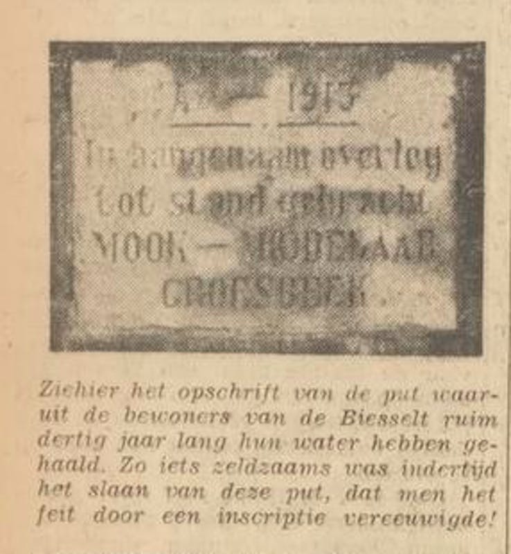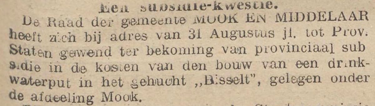 … afwijzend op een adres van den Raad der gemeente Mook en Middelaar om subsidie in de kosten van den bouw van een drinkwaterput in het gehucht “Bisselt”. (Limburger koerier, 03-12-1912).