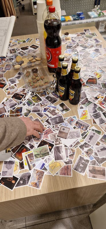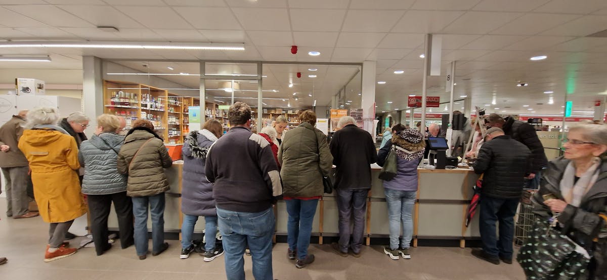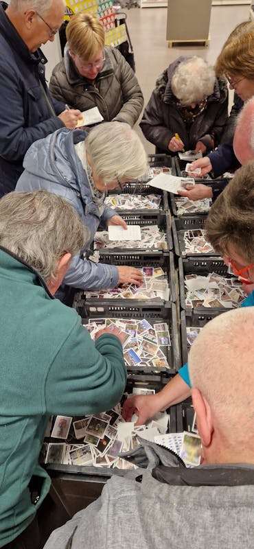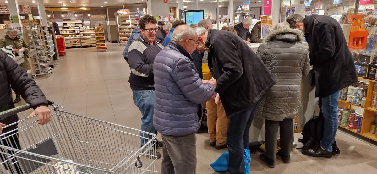 Het zag zwart van de mensen bij de plaatjesruilbeurs donderdag in de Mookse Plus. Of eigenlijk overwegend grijs. Want waar normaal gesproken kinderen elkaar verdringen om hun plaatjesalbum vol te krijgen waren het nu (vaak oudere) volwassenen die fanatiek in de bakken graaien. Het afscheidskado van Wim Voet, een fotoboek met plaatjes over heden en verleden van onze omgeving, moest vol! Er stond een tafel met foto's in genummerde mandjes. Maar vanwege de drukte begonnen mensen op allerlei plekken in de winkel kleine ruilbeursjes. Op de kassa band, op de inpaktafel en de balie van de drogisterij. Het leek wel bingo. Wie heeft nr 33. Ik zoek 184. Hier ik heb 3x 78 dubbel. Het was een vrolijke boel, iedereen hielp elkaar zoeken. Wim zorgde voor versnaperingen. Bedankt Wim voor dit leuke afscheidskado!