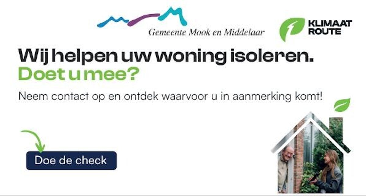 Aanmelden voor lagere energiekosten en meer comfort in huis Huiseigenaren kunnen zelf online een aanmeldcheck doen via www.klimaatroute.nl/mookenmiddelaar. Na het invullen van de postcode en het beantwoorden van een aantal vragen is direct zichtbaar of de bewoner in aanmerking komt voor de subsidie en het gratis advies. Daarna kan er een afspraak gemaakt worden.