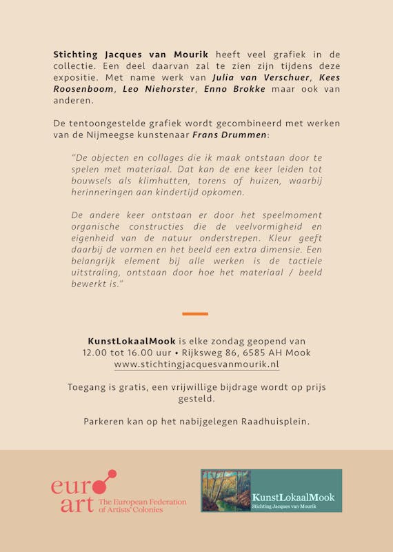KunstLokaalMook is elke zondag geopend van 12.00 tot 16.00 uur. De toegang is gratis.
