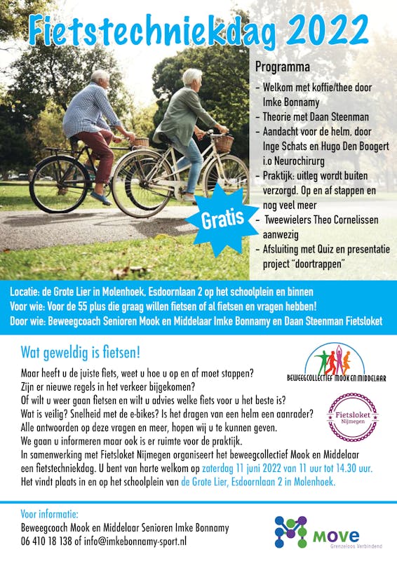 In samenwerking met Fietsloket Nijmegen organiseert het beweegcollectief Mook en Middelaar deze fietstechniekdag. U bent van harte welkom op zaterdag 11 juni 2022 van 11 uur tot 14.30 uur. Het vindt plaats in en op het schoolplein van de Grote Lier, Esdoornlaan 2 in Molenhoek. Het is gratis en u en eventueel uw fiets (als je daar vragen over heeft) van harte welkom.
