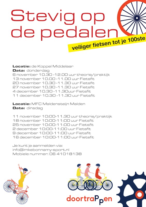 Fietsen is heel fijn! Daarom is het belangrijk om veilig te blijven fietsen. Stevig op de pedalen is ervoor om je informatie te geven over wat jezelf zou kunnen aanpassen om langer te kunnen blijven fietsen. Verder wordt er bruikbare informatie verstrekt en is er ruimte voor een interactie gesprek tussen de deelnemers. 1 theorieochtend en wat praktijk en daarop volgend 5 lessen Fietsfit zonder fiets! Het is gratis, dus kom mee doen! Er gaan twee cusussen starten Malden en Middelaar. Je kunt je opgeven bij Imke Bonnamy