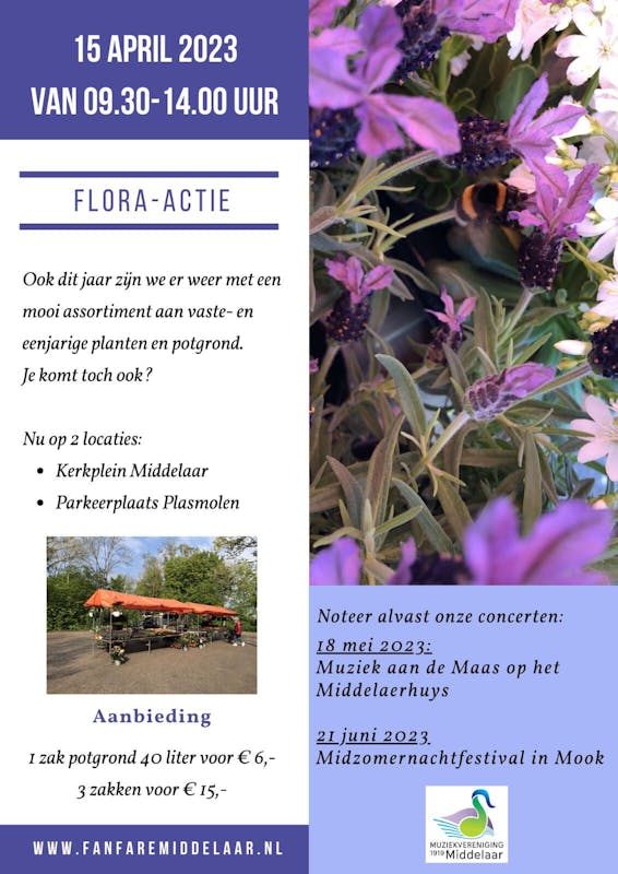 De jaarlijkse flora actie van Muziekvereniging Middelaar wordt dit jaar op twee plaatsen gehouden. Zaterdag 15 april kun je van 9.30 tot 14.00 uur weer vaste planten, eenjarige planten en potgrond kopen op het kerkplein in Middelaar en op de parkeerplaats in Plasmolen. Komen jullie ook! De vrijwilligers helpen jullie graag bij jullie keuze en de muziekvereniging heeft weer wat meer speelruimte door de opbrengst.