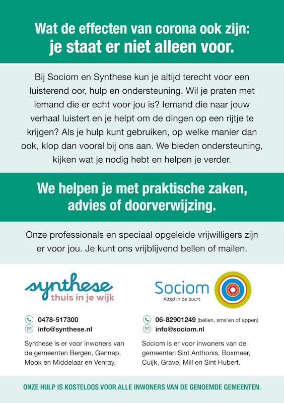 Bij Sociom en Synthese kun je altijd terecht voor een luisterend oor, hulp en ondersteuning. Wil je praten met iemand die er echt voor jou is? Iemand die naar jouw verhaal luistert en je helpt om de dingen op een rijtje te krijgen? Als je hulp kunt gebruiken, op welke manier dan ook, klop dan vooral bij ons aan. We bieden ondersteuning, kijken wat je nodig hebt en helpen je verder.