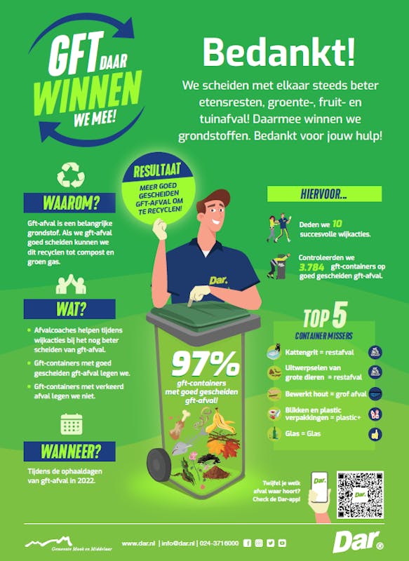 In 2022 hield Dar acties in de hele regio om de kwaliteit van het gft-afval – en dus etensresten, groente-, fruit- en tuinafval – te verbeteren. En met resultaat! Steeds meer inwoners scheiden beter het gft-afval. Hierdoor wordt het gerecycled tot compost en groen gas. Dit jaar gaat Dar door met de acties voor de verbetering van gft-afval en plastic+.