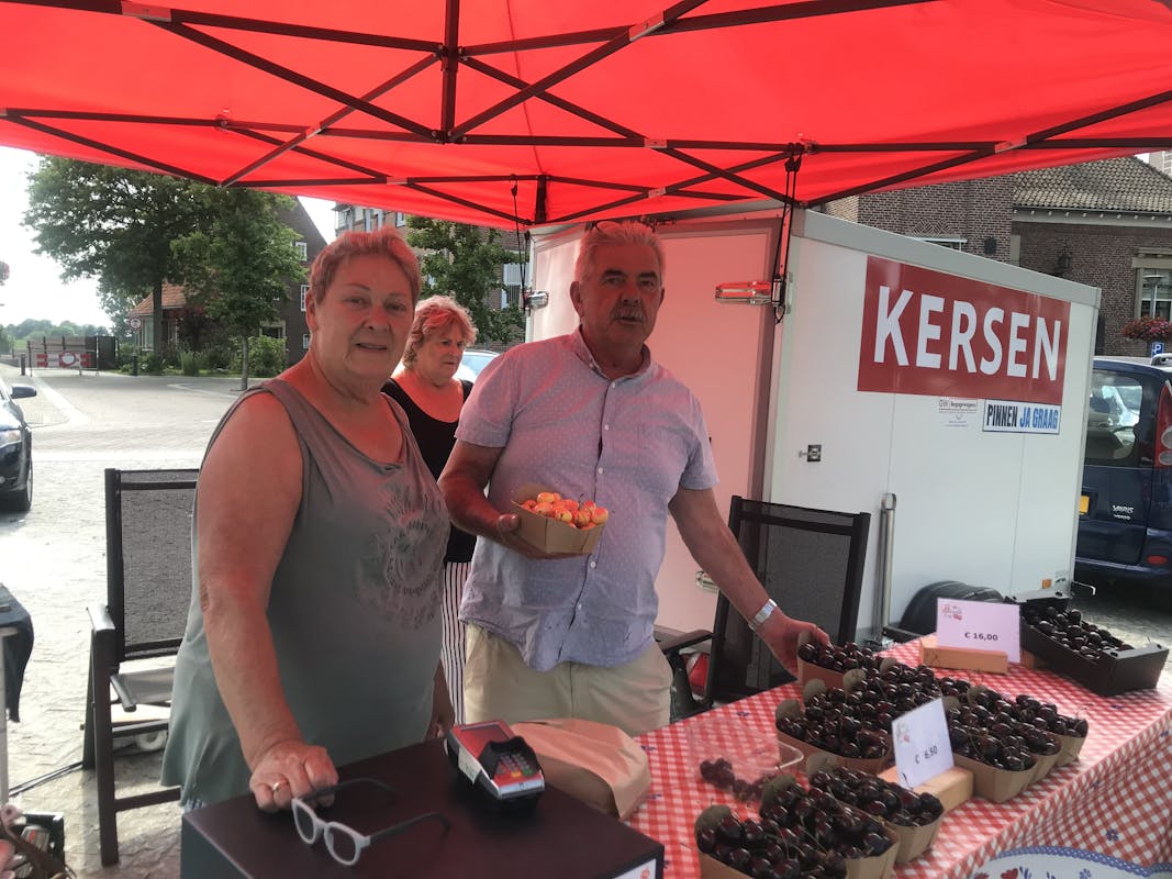 Ze zijn er weer! Heerlijke kersen op het Raadhuisplein in Mook. De Mookenaren Chris en Trix Eltink verkopen er dikke zwarte en gele kersen die geplukt worden in het Land van Maas en Waal. Ze staan er dagelijks met hun kraam van 9.00 tot 17.00 uur. Tot ongeveer eind augustus nog.