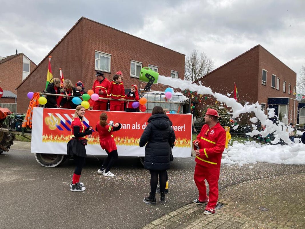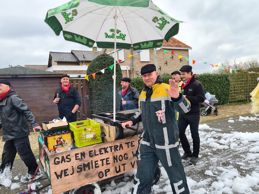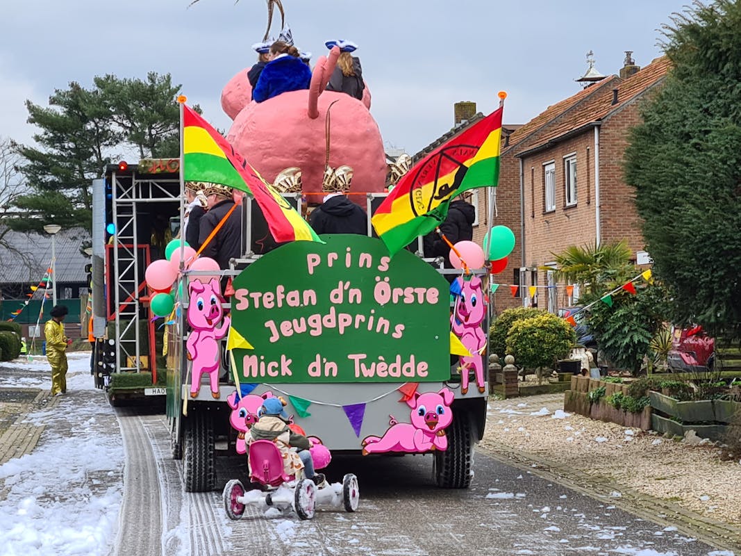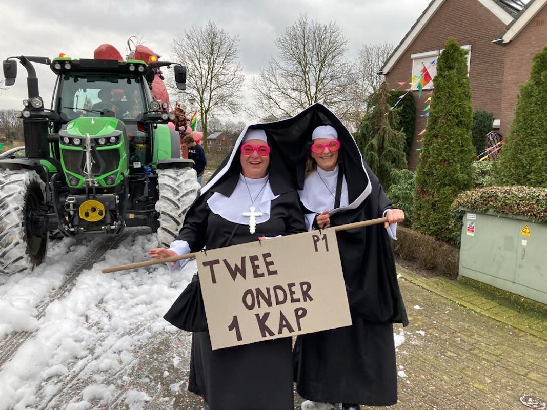Wat was het weer een feest met de optocht in Middelaar! Iedereen had erg zijn best gedaan. De feestfabriek was er bij in al zijn grootsheid en daar moesten wat obstakels langs de weg voor worden verwijderd maar het feesten ging maar door. We hadden ook een schuimkanon zodat iedereen in de sneeuw kon dansen. Een rad van fortuin kwam ook voorbij en als je de haan kon draaien mocht je een liedje kraaien. Als laatste kwam onze boerenbruidegom Robert, zeker te lang opgehouden bij zijn boerenbruidje. Hoewel uit betrouwbare bronnen hoorde ik dat hij altijd te laat was. Daarna nog wat feestvierders op de fiets en toen ging het feest ien d'n Trog verder. Fijne carnaval allemaal. Alaaf alaaf alaaf!