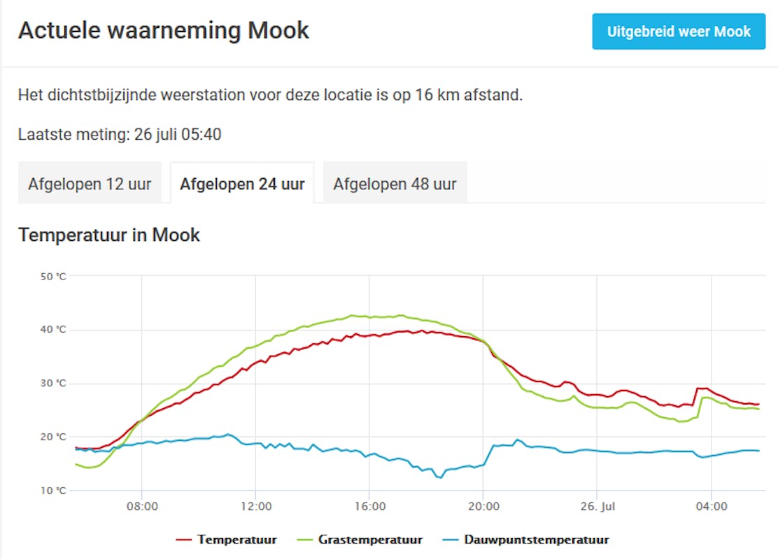 Het dichtstbijzijnde (weerplaza) weerstation op 16km geeft zelfs 40+C aan!