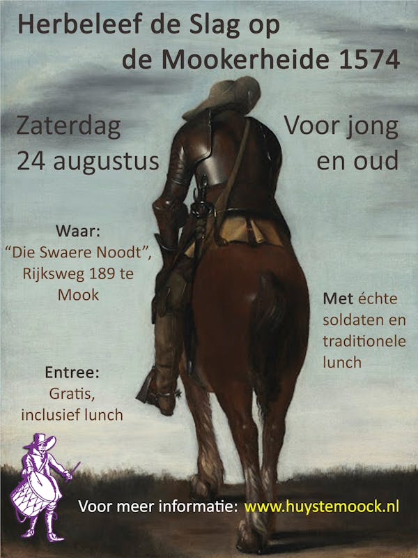 Op zaterdag 24 augustus gaan wij terug naar 1574, de Slag op de Mookerheide. In de sfeer van toen wordt het verhaal verteld van de Tachtigjarige Oorlog in onze streek. De gasten worden in stijl ontvangen door Teun Tamboer, zo weggelopen uit het huurlingenleger van Lodewijk en Hendrik van Nassau. In een grote ketel boven het vuur gaart een maaltijd naar historisch recept, terwijl soldaten, weggelopen uit de geschiedenisboekjes hun wapentuig demonstreren. Ook de spannende legendes van Kiste Trui, de Dwaallichtjes en het Moocks Raampje ontbreken niet! Tijdens een prachtige wandeling over de bloeiende heide wordt het verhaal verteld van de beroemde Slag die hier op 14 april 1574 werd uitgevochten tussen het huurlingenleger van Lodewijk en Hendrik van Nassau, twee jongere broers van Willem van Oranje, en het Spaanse leger van Don Sancho d’Avila.