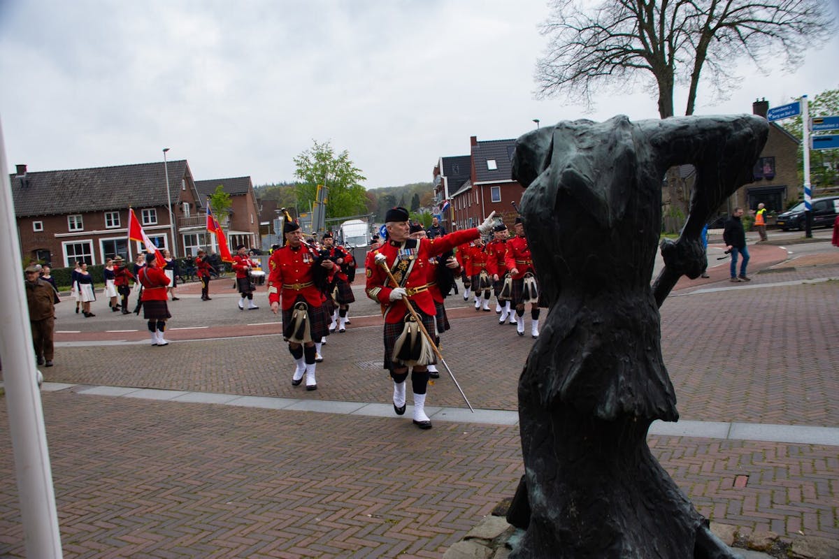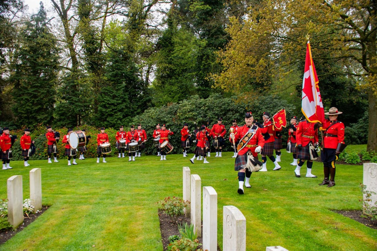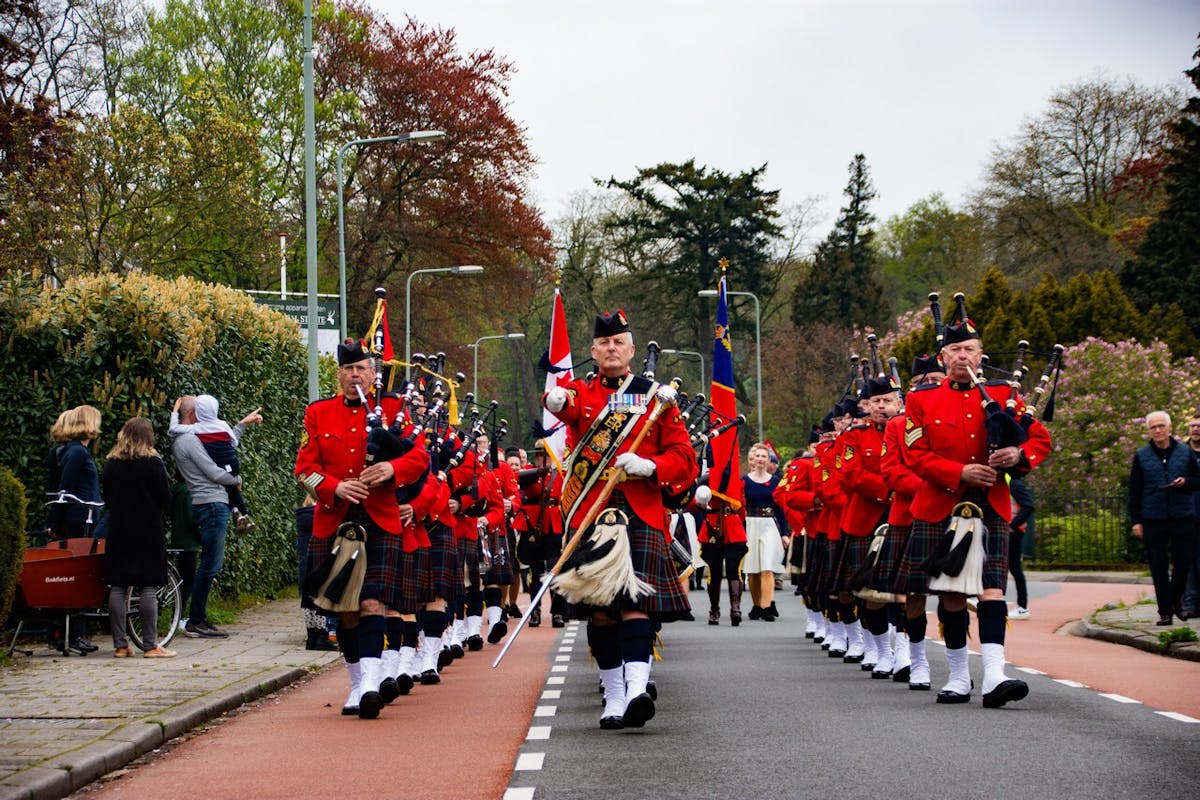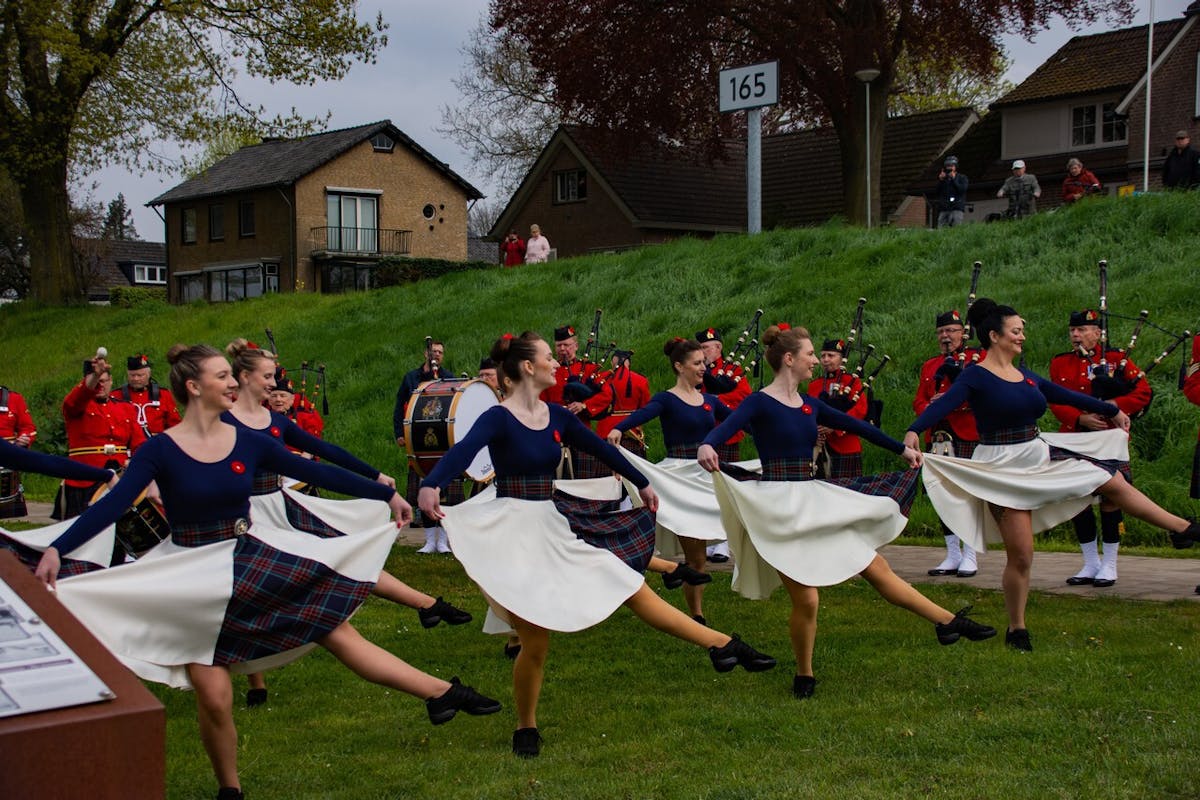 op 29-04-2023 waren de Royal Canadian Mounted Police piper, drums and dancers. eerst op de oorlogsbegraafplaats en dan op weg naar het gemeentehuis en verder verdeling bij het monument bij de oude veerstoep