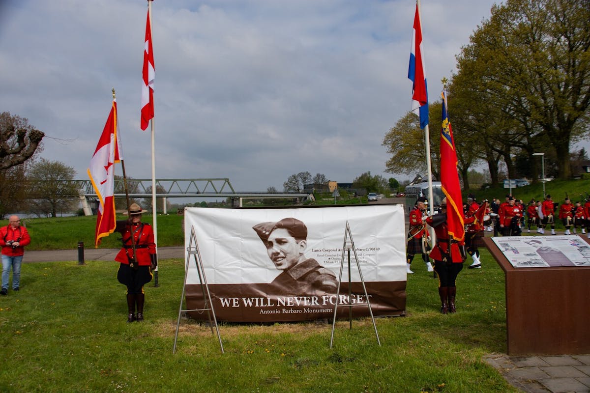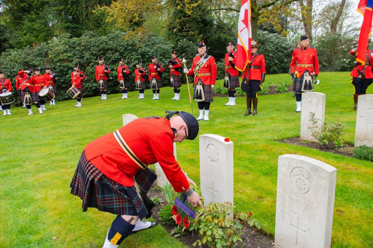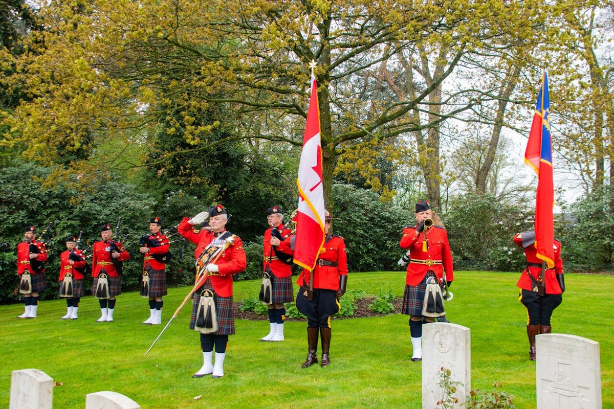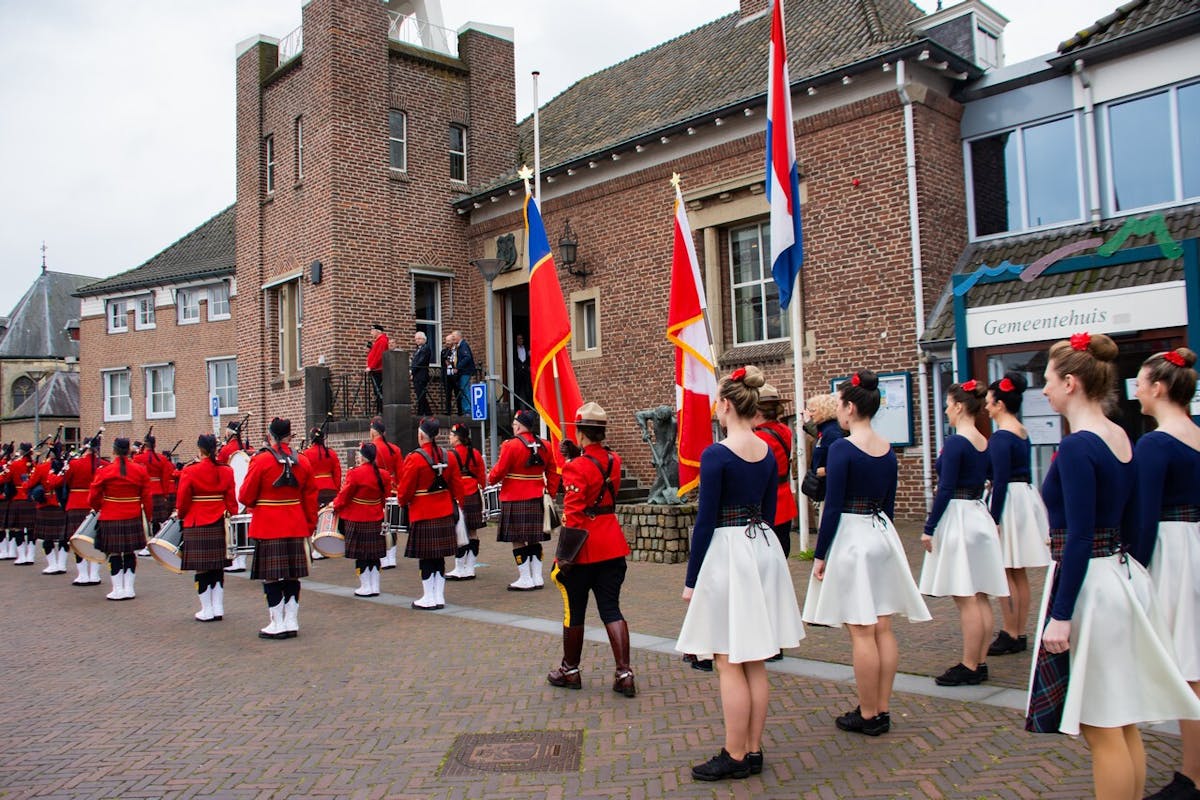 op 29-04-2023 waren de Royal Canadian Mounted Police piper, drums and dancers. eerst op de oorlogsbegraafplaats en dan op weg naar het gemeentehuis en verder verdeling bij het monument bij de oude veerstoep