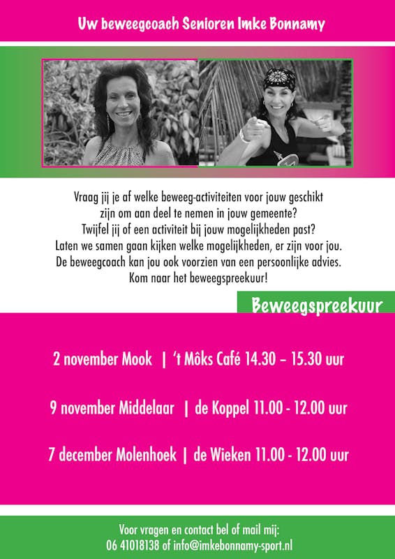 Heeft u vragen over bewegen in uw gemeente, of wilt u meer informatie over een fittest? Maar ook wat kan ik nog en heeft u een advies voor mij? Dan bent u bij mij aan het juiste adres. Het is vrijblijvend om bij mij langs te komen op de verschillende locaties. Ik zie u graag om te kijken wat ik voor u kan doen, groetjes Imke Bonnamy