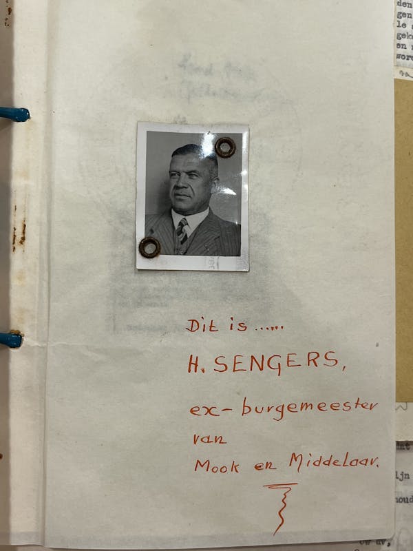 Naar aanleiding van een verzoek van Ct- O. D. te Mook is door den gemeentesecretaris en secretariepersoneel der gemeente Mook en Middelaar het volgende rapport opgesteld omtrent den burgemeester dier gemeente, H. J. J. Sengers, betreffende verschillende gedragingen tijdens de duitsche bezetting van Nederland.