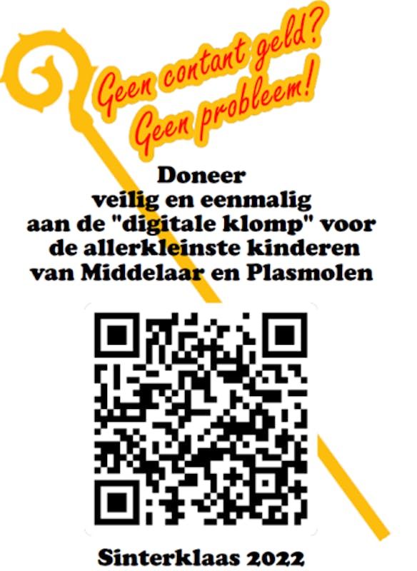 Zoals voor velen bekend wordt elk jaar met de klompenactie gevraagd om een (financiële) bijdrage om het feest mogelijk te maken. Dit jaar is er van 31 oktober t/m 13 november met de klomp gelopen. Mocht u de klomp gemist hebben en toch graag iets in de klomp hebben gedaan, vanaf dit jaar kan er ook gebruik gemaakt worden van een QR code waarmee digitaal een bijdrage gestort kan worden.
