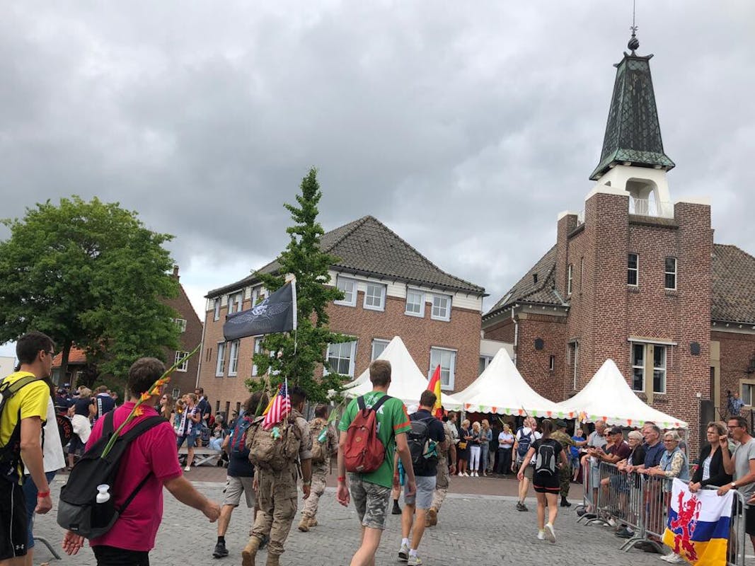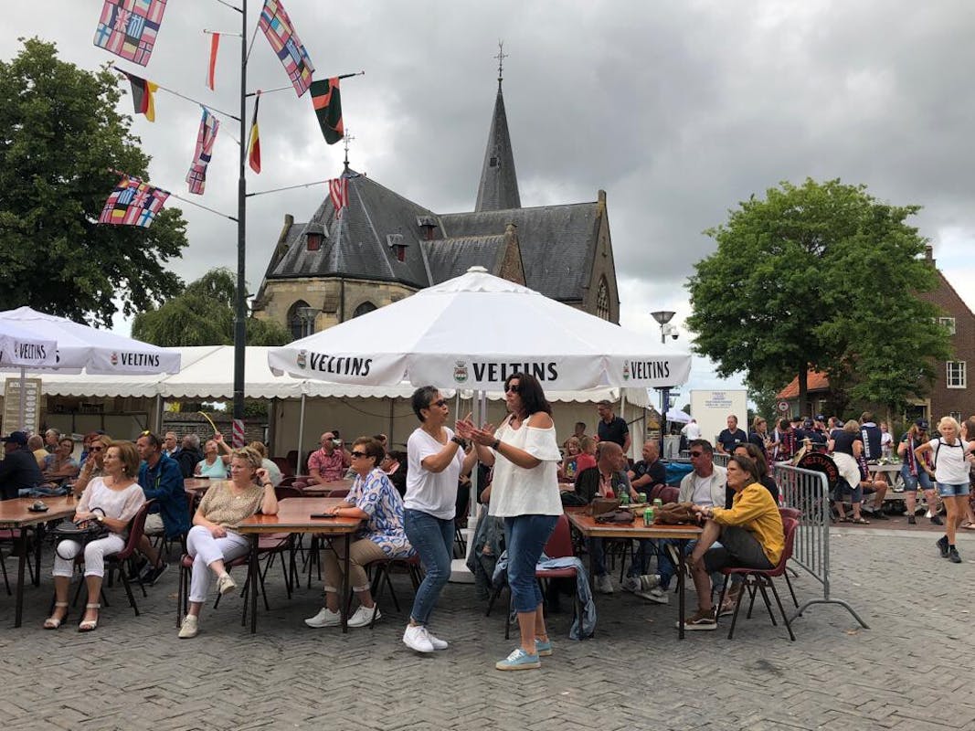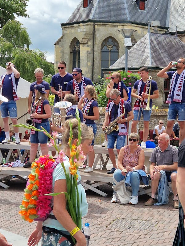 De Heituters knallen op het Raadhuisplein. Hun muziek geeft de lopers vleugels. Ze trekken langs de witte tent met officials de Rijksweg op. De stemming zit er rond het middaguur helemaal in. Sommige dames wagen een dansje. Het is een daverend spektakel.