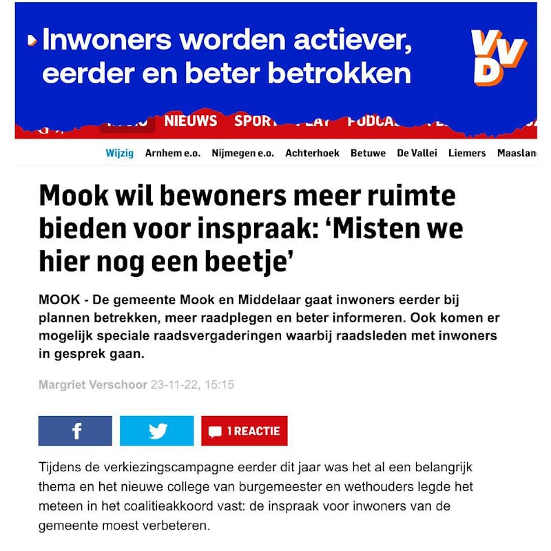 Bij beslissingen uit het verleden hebben inwoners te vaak buiten spel gestaan. Vandaar dat wij als VVD blij zijn met de nieuwe aanpak om inwoners beter te betrekken bij gemeentelijk beleid en besluitvorming. In een recent interview met De Gelderlander gaf onze wethouder Holger Rodoe een toelichting op de nieuwe werkwijze rondom inwonerparticipatie. Het raadsvoorstel hiervoor kon tijdens de afgelopen vergadering rekenen op unanieme steun vanuit de gemeenteraad, daarmee is dus de weg vrij om in 2023 volop aan de slag te gaan samen met alle inwoners!