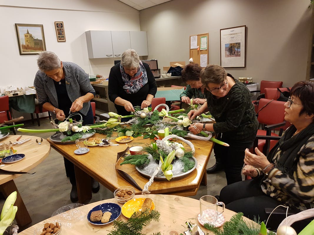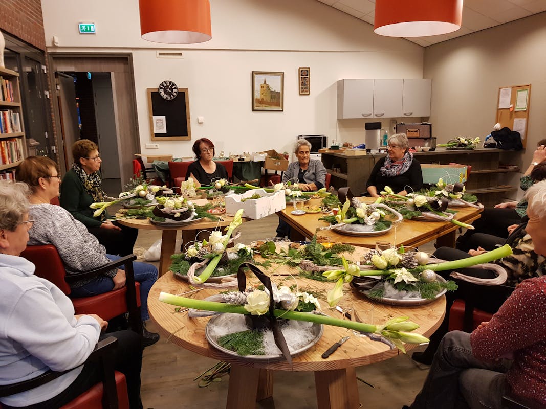 Deze decembermaand hebben we al een paar leuke activiteiten gehad in de Dõrpskamer. Na het pepernoten bakken van de kinderen hebben we met 10 dames onder de bezielende leiding van Corrie (die trouwens ook de Koppel elke keer zo mooi aankleedt) een prachtig Kerststuk gemaakt. Daar mochten we mee thuis komen. Ook hebben we voor de vrijwilligers een gezellige high tea middag gehad, weer uitstekend verzorgd door Karin. Dat hadden onze vrijwilligers ook wel verdiend want zonder hen geen Dõrpskamer en geen eetpunt. Donderdag 19 december om 14.00 uur sluiten we dit jaar af met een Kerstviering om 14.00 uur. De muzikale Kerstman komt ons dan met 2 van zijn elfjes bezoeken. Jullie zijn allemaal welkom. Dinsdag 7 januari 2020 ( jawel dan is het alweer zo ver) openen we de Dörpskamer weer met een Nieuwjaarsreceptie om 14.00 uur en daarna zijn we de dinsdagen weer open van 14.00 u tot 16.00 uur en de woensdagen van 10.00 u tot 12.00 uur. Verder hebben we in 2020 nog diverse activiteiten die in de Dorpskrant worden vermeld. Graag tot ziens allemaal en hele fijne Kerstdagen en een gelukkig 2020!