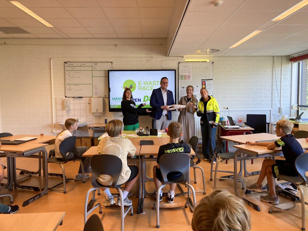 Op basisschool De Maaskei in Mook is de E-waste Race van start gegaan. Vier weken lang gaan leerlingen in onze regio de strijd aan met oud en kapot elektronisch afval. Een mooi initiatief van onze afvalinzamelaar Dar! Dat is niet alleen leuk en leerzaam, maar ook keihard nodig. Nog steeds blijft de helft van ons e-waste ongebruikt op zolders en in lades liggen. Terwijl juist daar waardevolle grondstoffen in schuilgaan die een tweede leven verdienen.