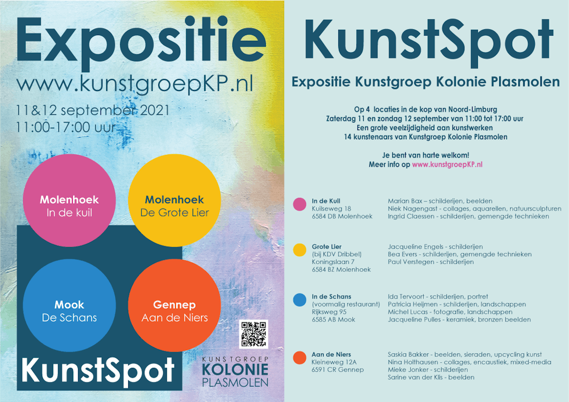“Eindelijk kunnen we weer exposeren!” Met een brede lach kondigen de leden van Kunstgroep Kolonie Plasmolen hun nieuwste activiteit aan. Op zaterdag 11 en zondag 12 september 2021 zetten ze de deuren wagenwijd open. Bezoekers kunnen op vier locaties genieten van hedendaagse kunst, zoals beeldhouwwerk, schilderijen, foto’s, sieraden en mixed media. Veertien leden van de groep zijn het hele weekend aanwezig om hun werk te tonen en te vertellen over hun inspiratiebonnen. De expositielocaties zijn in Molenhoek, Mook en Gennep, de toegang is gratis.