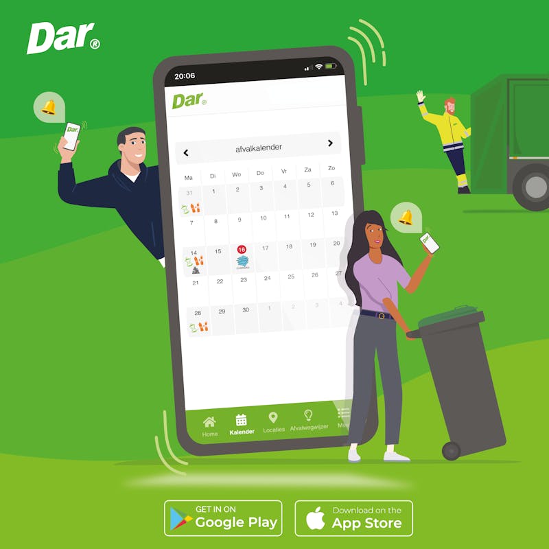 Bekijk je digitale afvalkalender in de Dar-app of check www.dar.nl/afvalwijzer. Zo heb je altijd uw persoonlijke afvalkalender bij de hand! Je kunt in de app instellen dat je een seintje krijgt, wanneer je welk afval aan de straat kunt zetten. Makkelijk toch?
