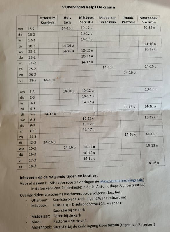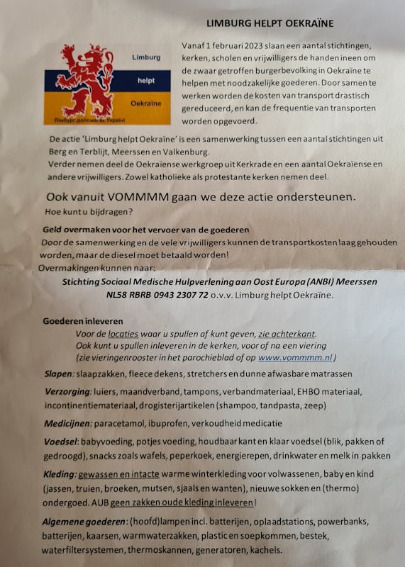 Een aantal stichtingen, scholen en vrijwilligers slaan de handen ineen om de zwaar getroffen burgerbevolking in Oekraïne te helpen met noodzakelijke goederen. Zie voor meer informatie bijgevoegde foto's