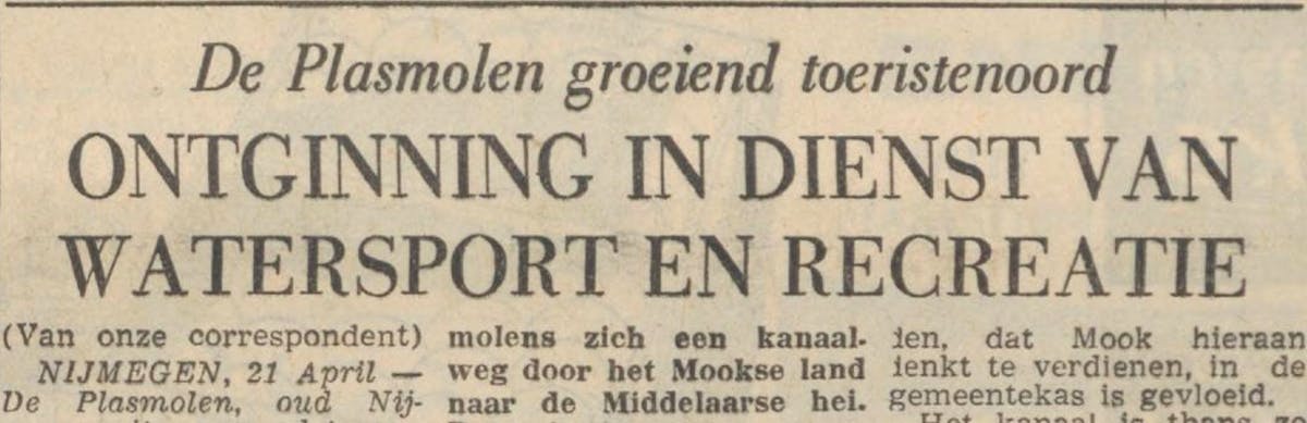 De Plasmolen, oud Nijmeegs uitgaansoord tussen Mook en Gennep, wist zich in vijf jaren tijds op te werken tot toeristenplaats van internationale faam. Letterlijk uit de steile zandgrond van de laatste Limburgse heuvels moesten de hoteliers hun volledig vernielde zaken na de oorlog weer opbouwen. Maar thans, nu de laatste twee hotels hun poorten kortgeleden weer openden, is men zover, dat een honderdtal gasten in dit vacantieoord een bed kan vinden. Bovendien zullen deze zomer voor de eerste maal rond honderd kampeerders elke nacht een goedkope slaapplaats op ruime zolders kunnen vinden. Meer dan ooit tevoren heerst er in die laatste uitlopers van het Duitse Reichswald, vroeger een Zondagsuitje voor Nijmegenaren, een opgewekt en internationaal toeristenverkeer. Niet de speeltafels, lawaaiige kermissen en grote feesten trekken honderden wandelaars, maar de heuvels, ruiger en steiler dan waar ook in ons land. Sinds bijna twee jaar wroeten sterke baggermolens zich een kanaalweg door het Mookse land naar de Middelaarse hei. Deze heide, droge zandgrond tussen Plasmolen en Maas, zal in de loop van de komende jaren worden veranderd In een uitgestrekt merengebied. Via een kanaal naar de Maas worden de plassen met open water verbonden waardoor het nieuwe watersportoord gemakkelijk per vaartuig bereikbaar wordt.