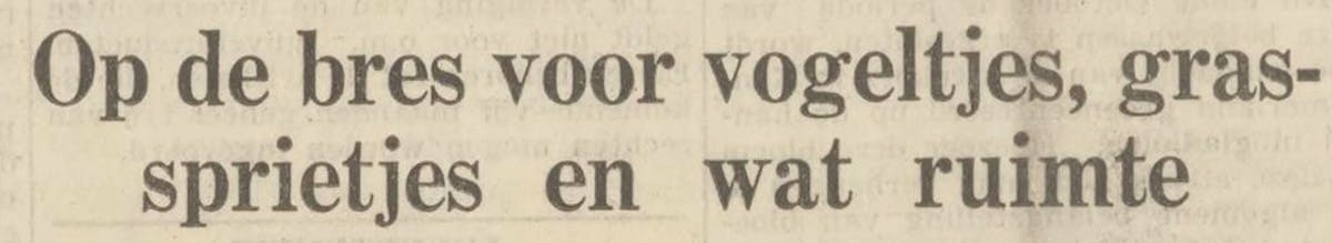 Onder de kop ‘Op de bres voor vogeltjes, gras- sprietjes en wat ruimte’, schenkt de krant aandacht aan het jaarverslag 1950/1951 van de Contactcommissie voor natuur- en landschapsbescherming. De contactcommissie is als overkoepelend orgaan van 77 organisaties het centrale lichaam van de particuliere natuurbescherming in Nederland.