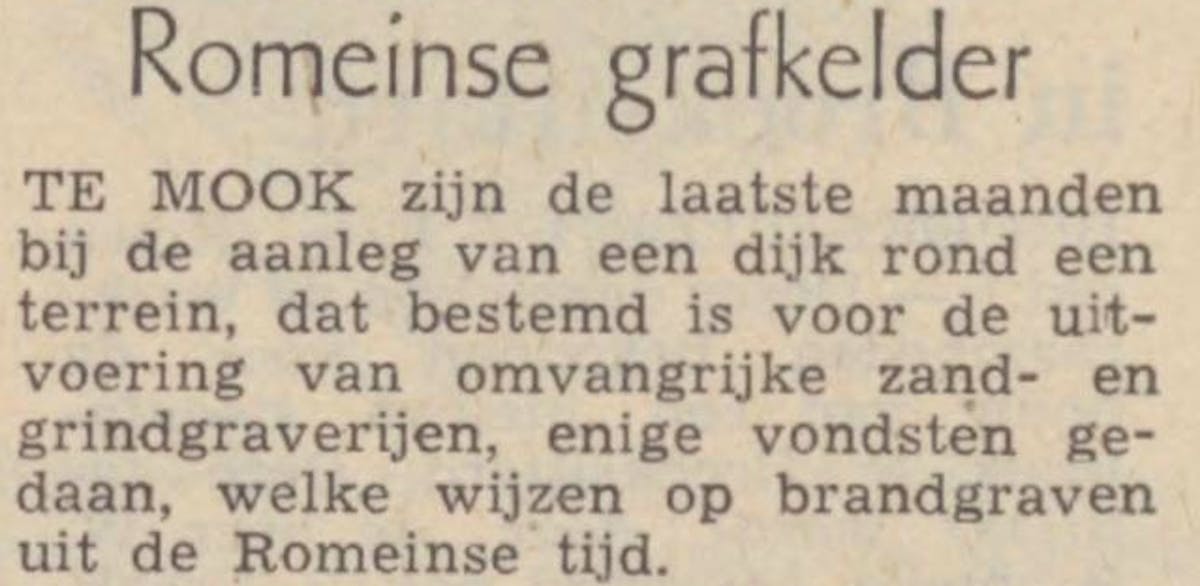 Te Mook zijn de laatste maanden bij de aanleg van een dijk rond een terrein, dat bestemd is voor de uitvoering van omvangrijke zand- en grindgraverijen, enige vondsten gedaan, welke wijzen op brandgraven uit de Romeinse tijd.