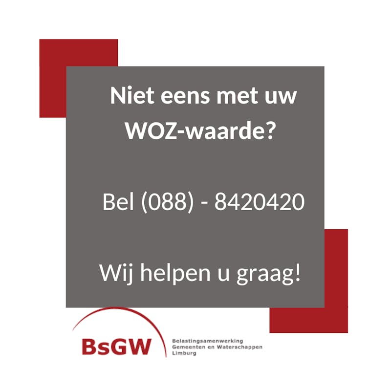 Er is heel wat te doen om de WOZ-waarde. En dat is logisch, want deze is van invloed op onder andere de hoogte van de onroerendezaakbelasting, de waterschapsheffing en het eigenwoningforfait. Daarom wilt u zeker weten dat de WOZ-waarde klopt. Twijfelt u of de WOZ-waarde van uw pand wel juist is? Of vindt u deze te hoog of te laag? Neem contact op met BsGW via 088-8420420. Zij helpen u graag! U kunt ook digitaal of schriftelijk bezwaar maken via de website van BsGW.