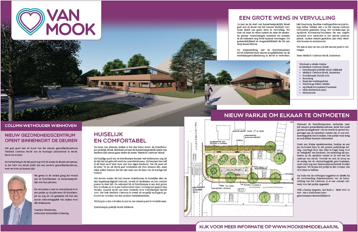 De verwachting is dat het pand nog vóór de zomer de deuren zal openen. In het Hart van Mook prijkt dan een modern gezondheidscentrum, waar we trots op kunnen zijn.