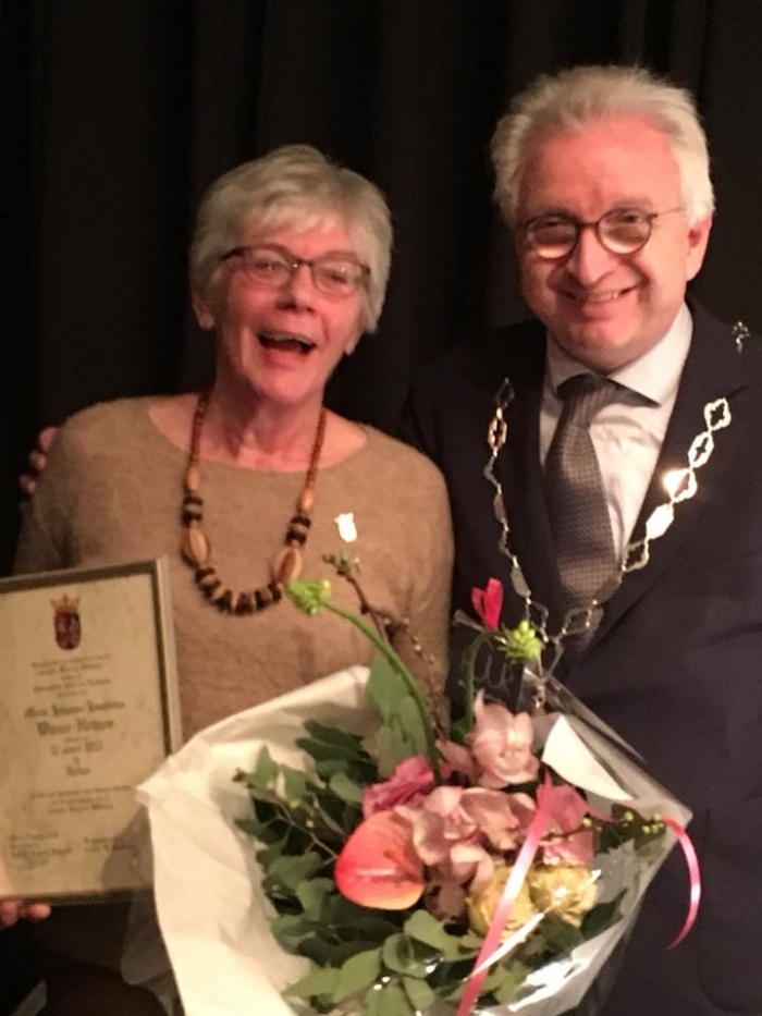 Geslaagde nieuwjaarsreceptie gemeente Mook Middelaar in dorpshuis De Wieken in Molenhoek met muziek van Orkest Divers. Met ook tot haar grote verrassing de uitreiking van een gemeentelijke speld van verdienste aan mevr. Marianne Wijnen-Heijnen voor onder andere haar vele activiteiten voor CV De Meulenwiekers, Tuinvereniging Middelwaert, Eendracht’30 en haar buurt De Singel. Dik Verdiend.